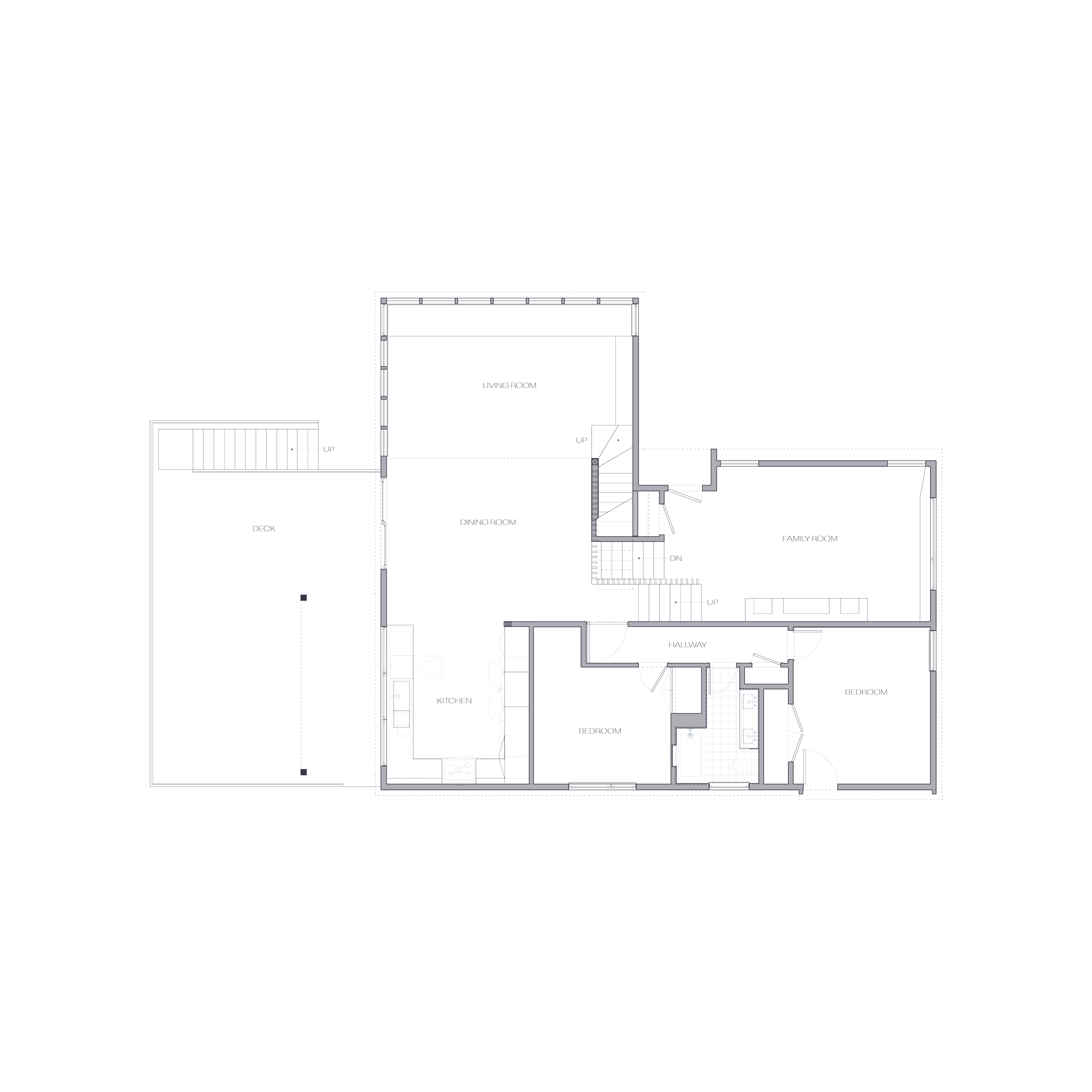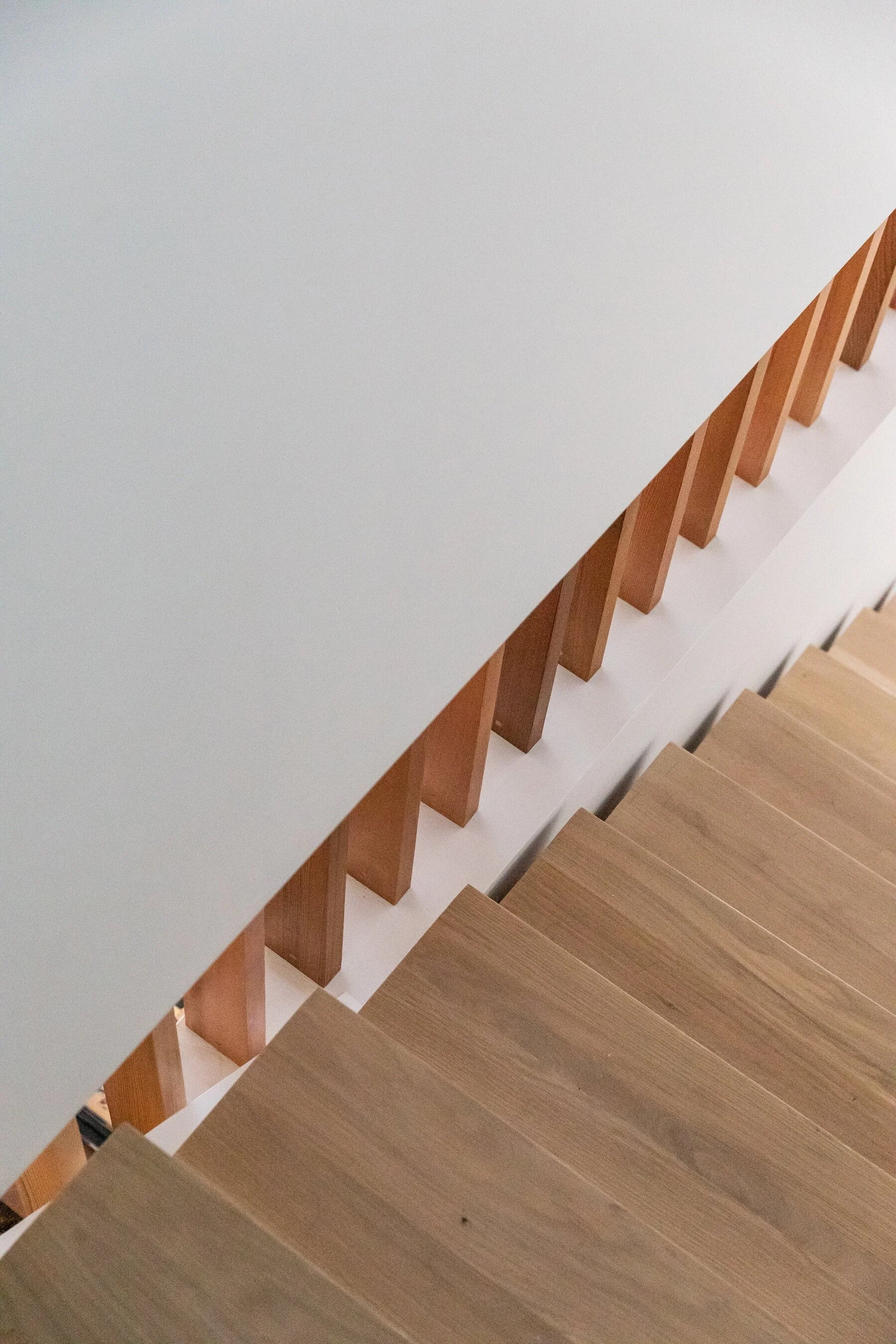 Key elements of the major renovation included replacing the circulation via a narrow spiral staircase through the four-level home with more functional and spacious stairs, as well as opening up the ocean-facing sun room to the dining room and kitchen to create a central, flowing main room. The project was guided by the desire to create comfortable, warm and family-oriented living spaces that also felt clean, uncluttered and contemporary. Additional work included replacing most of the windows, fully gutting and redesigning the kitchen and all baths as well as the insertion of the Red Cedar stair screen, which hugs the circulation core of the home, creating both separation and connection as one moves through the residence, catching glimpses of the ocean or the forest through the narrow, vertical slats.
